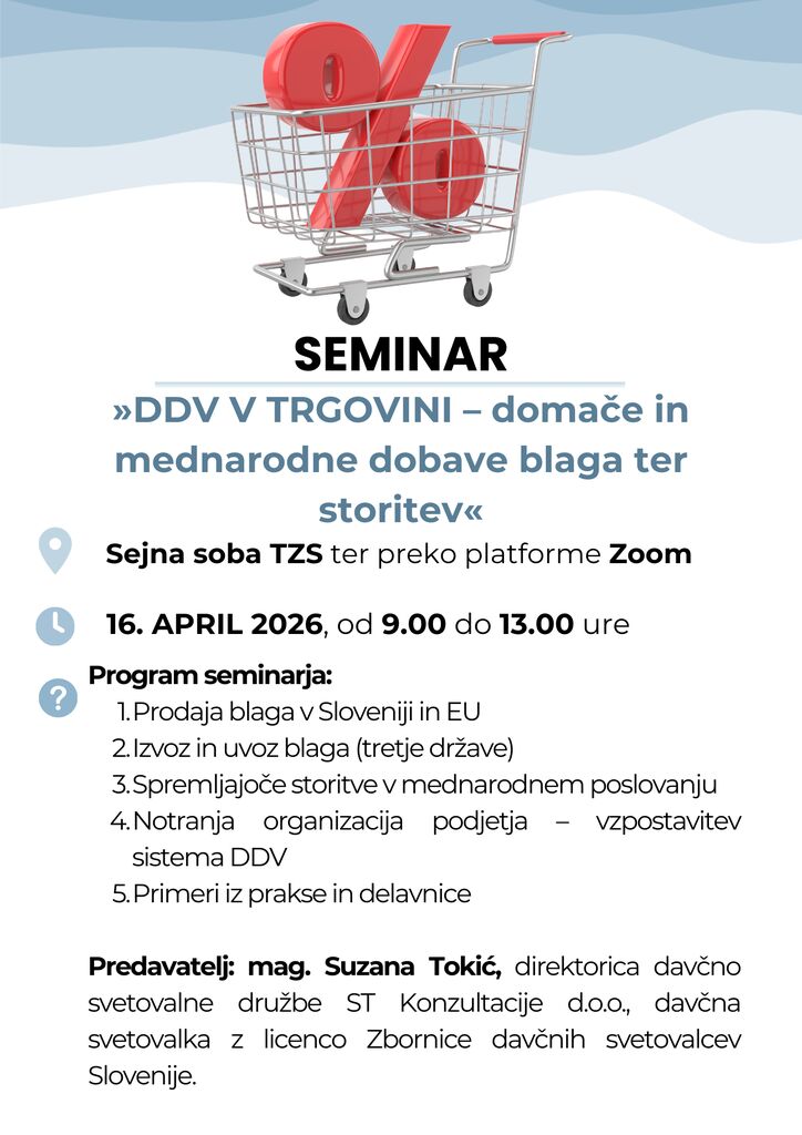 Vljudno vas vabimo, da se udeležite seminarja »DDV V TRGOVINI – domače in mednarodne dobave blaga ter storitev«, ki bo potekal dne 16. 4. 2026 med 9.00 in 13.00 uro, v sejni sobi Trgovinske zbornice Slovenije na naslovu Dunajska cesta 167 – Ljubljana.