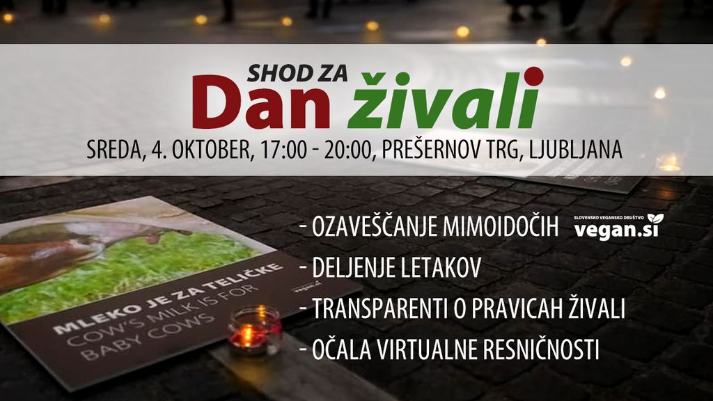 Ob svetovnem dnevu živali bomo na Prešernovem trgu mimoidoče z letaki, slikami in transparenti seznanjali o pravicah živali.