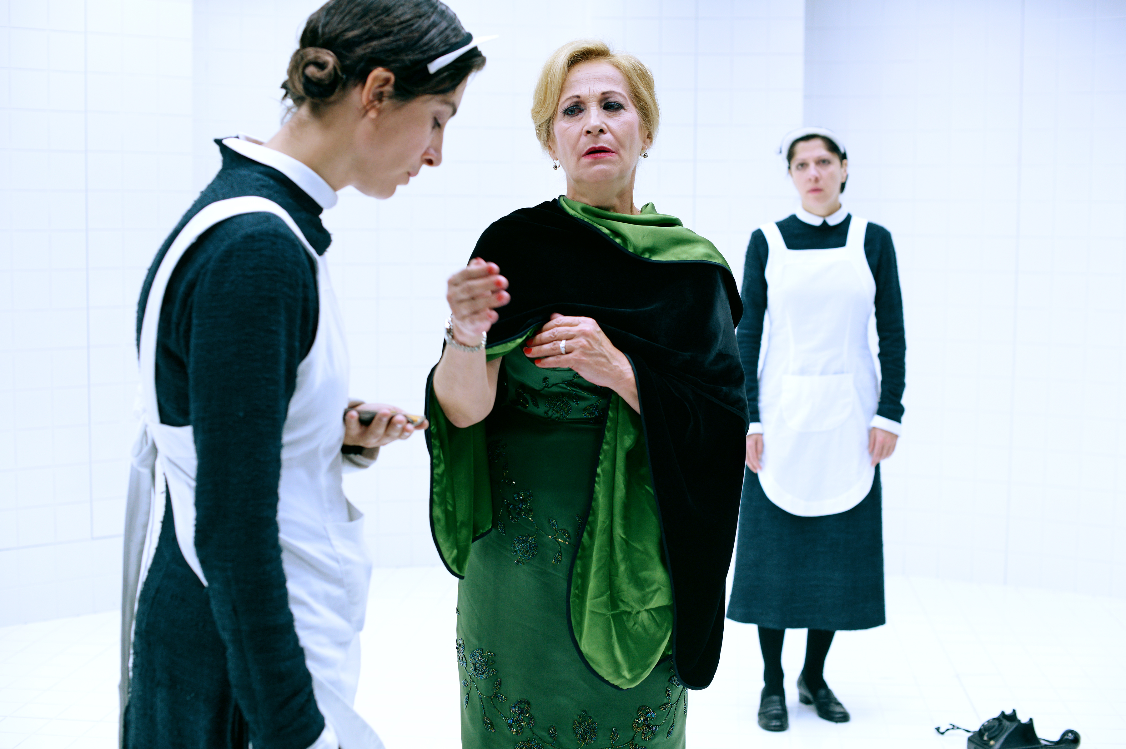 »Genetovi Služkinji sta doživeli že nešteto izvedbenih različic, tokratna pa se na nek način vrača k temeljem. V središče postavlja igralke, besedo, igro in sporočilo. Tako povsem igralska uprizoritev v izčiščenem, skorajda sterilnem izvedbenem prostoru razstavi stiske posameznika, njegove želje in pričakovanja,« je menil Klemen Markovčič na Radiu Slovenija. Pod veščo in trdno režijsko roko Vinka Möderndorferja sta kot služkinji, ujeti v začarani krog (sprevržene) ljubezni in sovraštva do Gospe in druga do druge, zablesteli Daša Doberšek in Janja Majzelj, Gospo, njun »objekt poželenja«, pa je z žlahtnim patosom vehementno odigrala lanska dobitnica Borštnikovega prstana Olga Kacjan.
