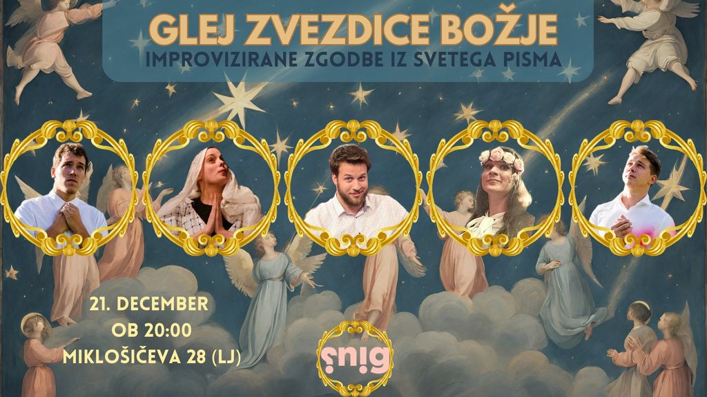 Člani SNiG Tim Kern, David Kristan, Olivija Grafenauer, Nina Sojar Košorok in Rok Bohinc bodo v četrtek, 21. decembra, ob 20. uri v Dvorani Jenko pripravili božični impro večer.