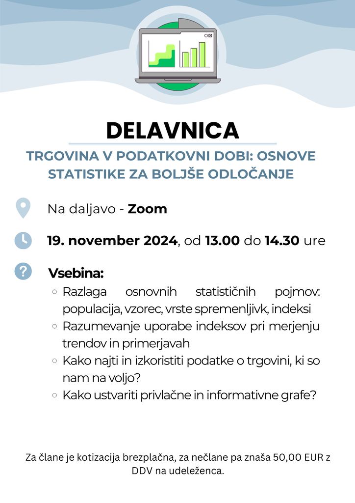 Vljudno vabljeni, da se nam dne 19. novembra 2024 med 13.00 in 14.30 uro, preko platforme ZOOM pridružite na delavnici »Trgovina v podatkovni dobi: Osnove statistike za boljše odločanje«.