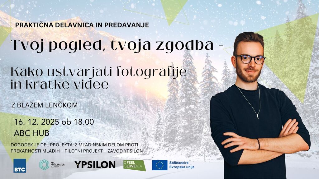 Zavod Ypsilon vabi na praktično delavnico fotografiranja in snemanja za družbena omrežja, kjer boste od profesionalnega fotografa Blaža Lenčka izvedeli, kako ustvariti vizualne vsebine, ki pritegnejo pozornost in izstopajo med poplavo objav. Kdaj in kje: 16. december 2025, Zavod Ypsilon, ABC Hub (stavba BTC Emporiuma), Latinski trg 6, 1000 Ljubljana Glavni del dogodka bo delavnica, na kateri boste spoznali: kako izbrati pravi kader in svetlobo, kako ustvariti estetske in učinkovite fotografije, katere so skrivnosti kratkih in privlačnih video vsebin, kako načrtovati vizualno zgodbo za družbena omrežja. Ali si vedel, da delo freelancerja prinaša svobodo, a tudi precej pasti? Po praktičnem delu bomo spoznali Blaža Lenčka – preko sproščenega pogovora o načinu dela in izzivih, ki jih prinaša samostojna ustvarjalna pot. Dogodek poteka v okviru projekta »Z mladinskim delom proti prekarnosti mladih – Pilotni projekt«, ki ga izvaja Zavod Ypsilon. Blaž Lenček je fotograf iz Slovenije, specializiran za fotografijo in snemanje. Je tehnični tip človeka, v katerem raste umetniška žila. Šolal se je kot tehnik računalništva, a nemudoma ob prvem stiku s kamero videl svoje prihodnje poslanstvo. Ponujena mu je bila priložnost za učenje fotografije in videografije pri lokalnem boljšem snemalcu. Le to je zagrabil in se vestno začel učiti. Napredek je bil opažen in strast do tovrstnega dela je nadaljeval na multimedijskem faksu. Uspešno je diplomiral in po zaključku študija odprl svoje podjetje. Blaž ima na področju fotografiranja in snemanja 10-letne izkušnje, zato smo ga kot mladega samozaposlenega povabili kot gosta. Na njegovi spletni strani si lahko ogledate galerijo različnih slik. Vabljeni!