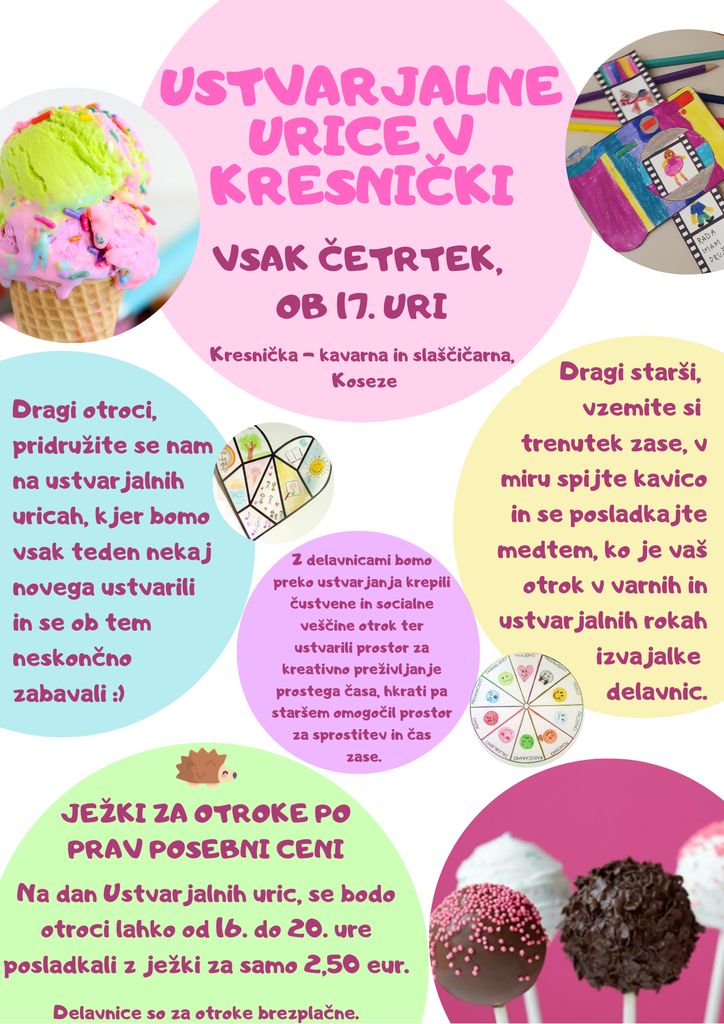 Dragi otroci, dragi starši, vsak četrtek vabljeni v kavarno in slaščičarno Kresnička na Ustvarjalne urice. Medtem, ko se bodo vaši otroci zabavali med ustvarjanjem, si boste lahko vi dragi starši, privoščili trenutek zase in v miru spili kavico. Delavnice so za otroke brezplačne. Lepo vabljeni :)
