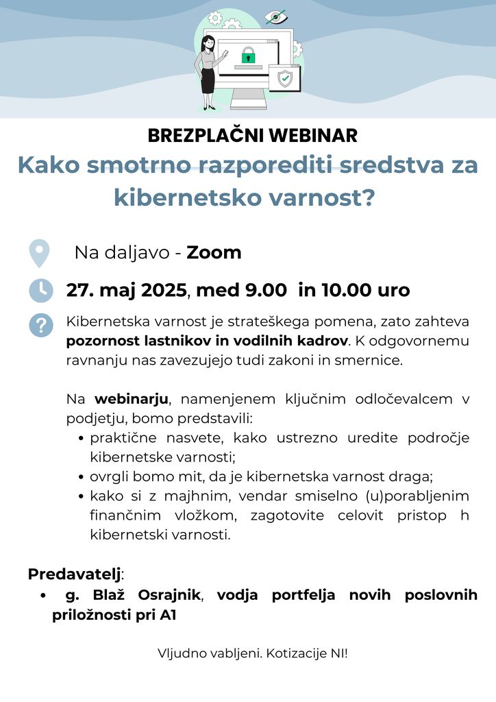 Trgovinska zbornica Slovenije bo v sodelovanju s svojim programskim partnerjem A1 Slovenija, d.d. dne 27. maja 2025 med 9.00 in 10.00 uro, preko spletne platforme ZOOM organizirala brezplačni webinar »Kako smotrno razporediti sredstva za kibernetsko varnost glede na velikost podjetja?«.