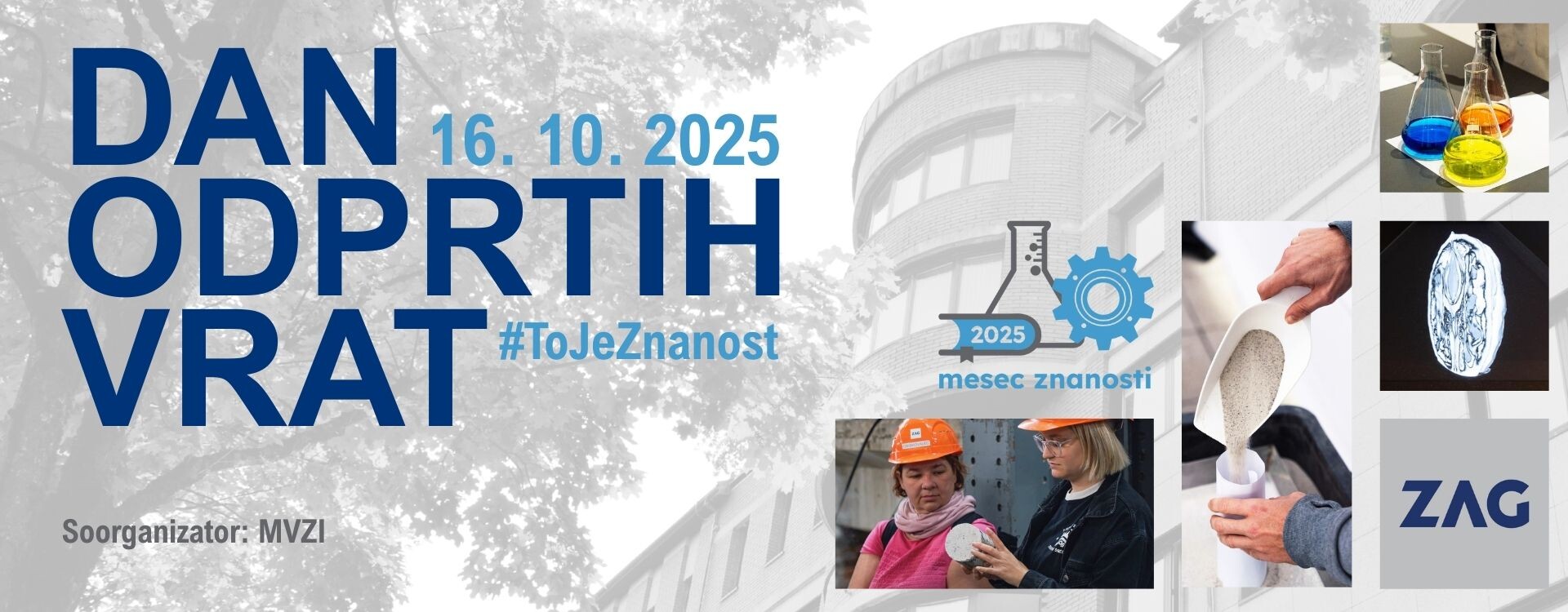 Zavod za gradbeništvo Slovenije (ZAG) v četrtek, 16. oktobra 2025, znova odpira svoja vrata! Letos Dan odprtih vrat prvič organiziramo v sklopu projekta Mesec znanosti 2025 skupaj z Ministrstvom za visoko šolstvo, znanost in inovacije. Vabimo vas, da si pridete ogledati naše laboratorije, naprave in opremo, spoznati naše raznoliko delo, se naučiti kaj novega o gradbeništvu, sodelovati v različnih nagradnih igrah in tekmovanjih ali pa se odpravite v naš Požarni laboratorij FRISSBE v Logatcu.