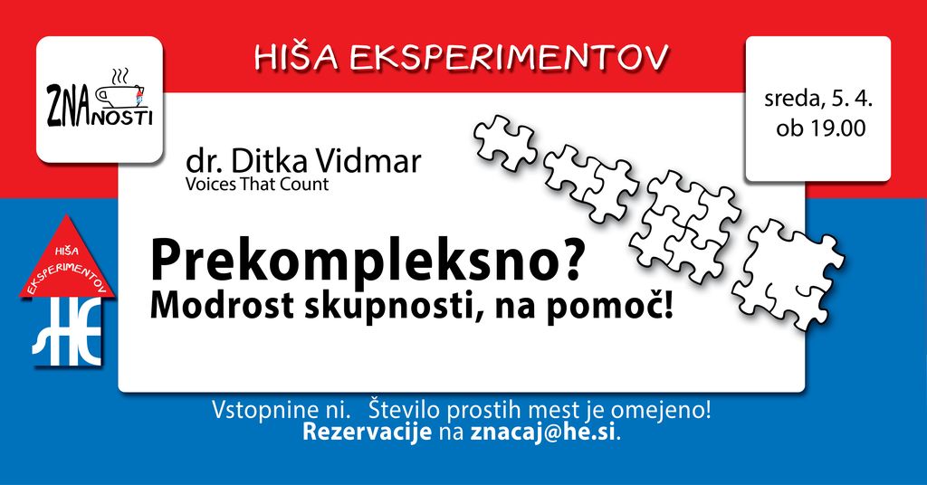 ZnaČAJ znanosti je poljudnoznanstveno predavanje ob čaju in sadju. Predavatelj na preprost način predava o svojem področju in običajno vključi v predavanje tudi nekaj humorja ter v splošnem komunicira s svojimi poslušalci. ZnaČAJi znanosti se po daljšem premoru vračajo v Hišo eksperimentov in ponovno približujejo znanost širši javnosti. Tokrat bo govora o reševanju kompleksnih družbenih problemov s pomočjo velikega števila ljudi in njihovih mnenj. Kako upoštevati vsa mnenja, bo pokazala dr. Ditka Vidmar.