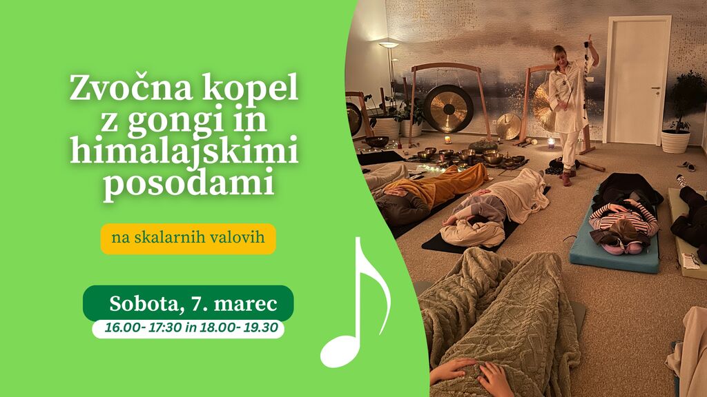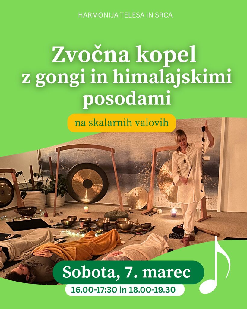 Vabljeni na sprostitveno zvočno kopel, kjer vas bodo nežni in globoki zvoki terapevtskih zvočnih posod in gongov popeljali v stanje globoke sprostitve. Zvok zvočnih posod prebuja vsa čutila ter deluje celostno – na telo, um in dušo. Pomaga pri hitrem in učinkovitem sproščanju napetosti, odpravljanju blokad v telesu ter podpira procese regeneracije in revitalizacije. Ob meditaciji z usmerjenim zvokom se postopoma vzpostavljajo notranji mir, čustveno ravnovesje, umirjen um in sproščeno telo. Zvočne vibracije nežno pomagajo telesu, da ponovno najde ravnovesje in se vrne v naravni tok delovanja. Zvočna kopel je namenjena: - globokemu in hitremu sproščanju napetosti - umirjanju misli in notranjega nemira - spodbujanju procesa samozdravljenja - preprečevanju izgorelosti ter zmanjševanju anksioznosti - lajšanju težav z nespečnostjo - odpravljanju energijskih in telesnih blokad - regeneraciji in revitalizaciji telesa Zvočna kopel poteka v Modri sobi, kjer boste deležni tudi skalarnih valov EES tehnologije, ki dodatno ustvarjajo koherenten, močan in podporen energijski prostor. S seboj prinesite podložko in vodo. Sobota, 7. marec od 16.00-17.30h in 18.00-19.30 Prispevek: 30 € Prijava na dogodek: info@ees-harmonija.si ali 064 294 204 Toplo vabljeni!