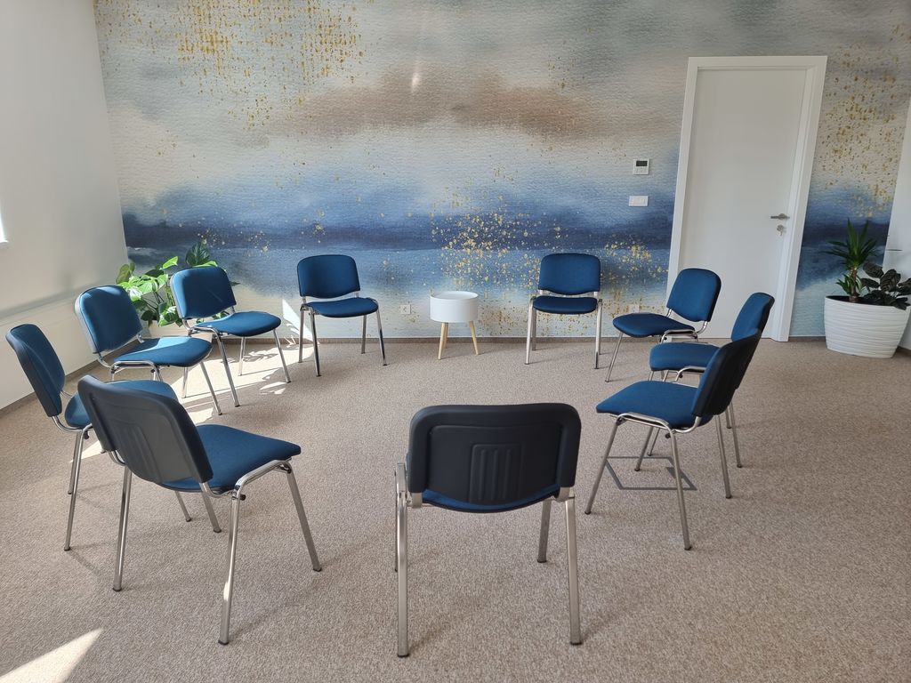 Modra soba, kjer potekajo delavnice čuječnosti, predavanja, meditacije, individualno mentorstvo in teambuildingi.