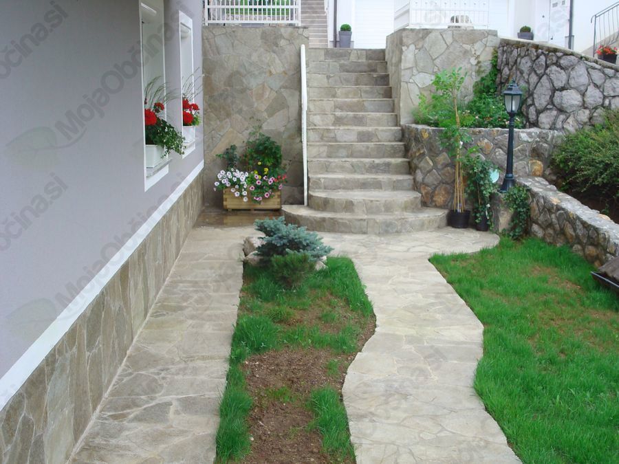 Naravni kamen je na voljo kot lomljenec, pravokotniki, kocke, dekorativni paneli in seveda variante z različnimi odtenki. Večje plošče se lahko polaga tudi direktno v zemljo, tako da izkopljemo zemljo pod površino kamna in podložimo malo peska ali mivke za boljše odtekanje vode. Robove kamna potem trava zaraste, učinek takih plošč pa je dvojen. Dobimo lepo dekoracijo in v dežju nomamo blatnih čevljev. Posega se zaradi enostavnosti lahko lotimo tudi sami.