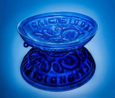 Posoda iz prosojnega modrega stekla z držajem in reliefno izpisano zdravico v grščini, ki pravi 'Pij, da bi živel večno, veliko let!', je bila izdelana v aleksandrijski ali sirijski delavnici; okvirno jo lahko datiramo v 4. stoletje.