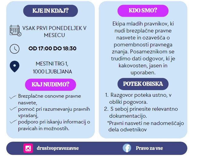 Predhodne najave niso obvezne, če želite, pa lahko vašo prisotnost na svetovanju ter vprašanje najavite na e-naslov: odgovor@pravozavse.si.