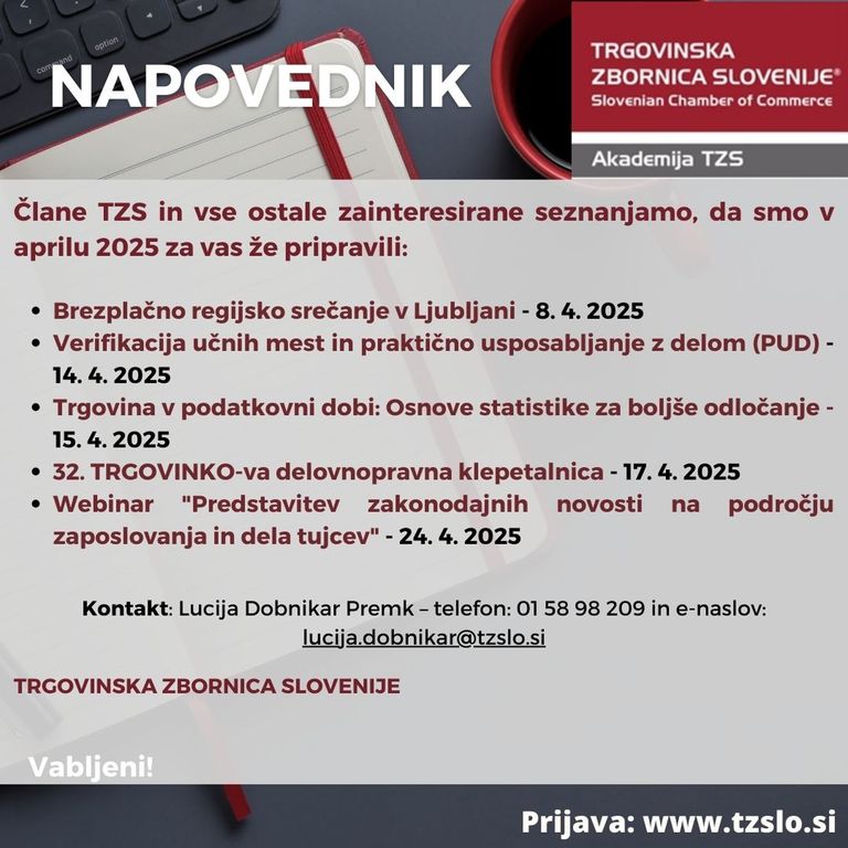 - Webinar »Predstavitev zakonodajnih novosti na področju zaposlovanja in dela tujcev« – 24. 4. 2025, ZOOM - PRIJAVA