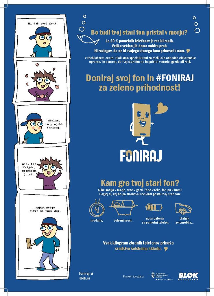 Letos smo k sodelovanju povabili osnovne šole, pri katerih telefone zbiramo v posebnih zabojčkih in jih dnevno stehtamo. Za zbrane kilograme odpadnih telefonov, bo podjetje Blok d.o.o. doniralo dobrodelna sredstva šolskemu skladu ali dobrodelnemu društvu. Za vsak kilogram zbranih telefonov (z baterijami) doniramo 2€.