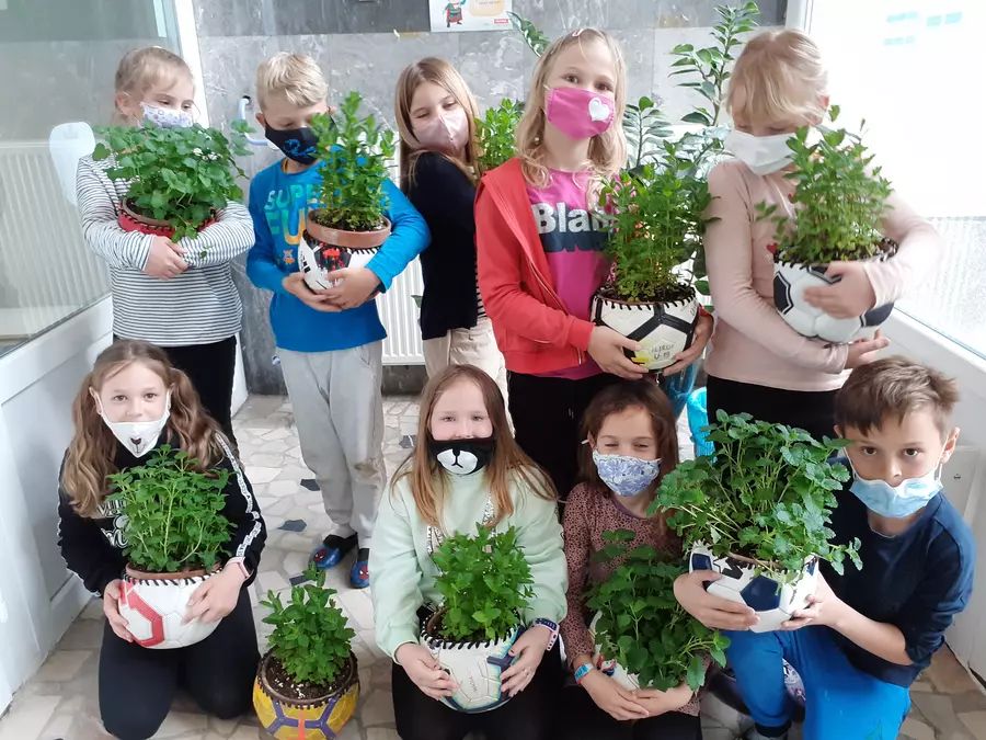 Učenke in učenci 2.c razreda so ustvarjali v času podaljšanega bivanja in likovnega pouka. Maja in Alenka iz Smetumeta sta jim pomagali pripraviti žoge, oni pa so rezali, vdevali vrvice, paličice in pisali spodbudne vzklike na reciklirane tablice. Že sama ideja, da je žoga lahko cvetlični lonček, je bila za otroke zabavna in navdihujoča.