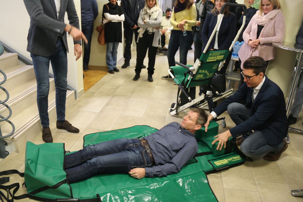 Oglejte si prikaz evakuacije naše uporabnice z evakuacijskim stolom Escape-Chair Volt, ki ga je na sedežu Zavoda Brez ovir izvedel Jani Modic: