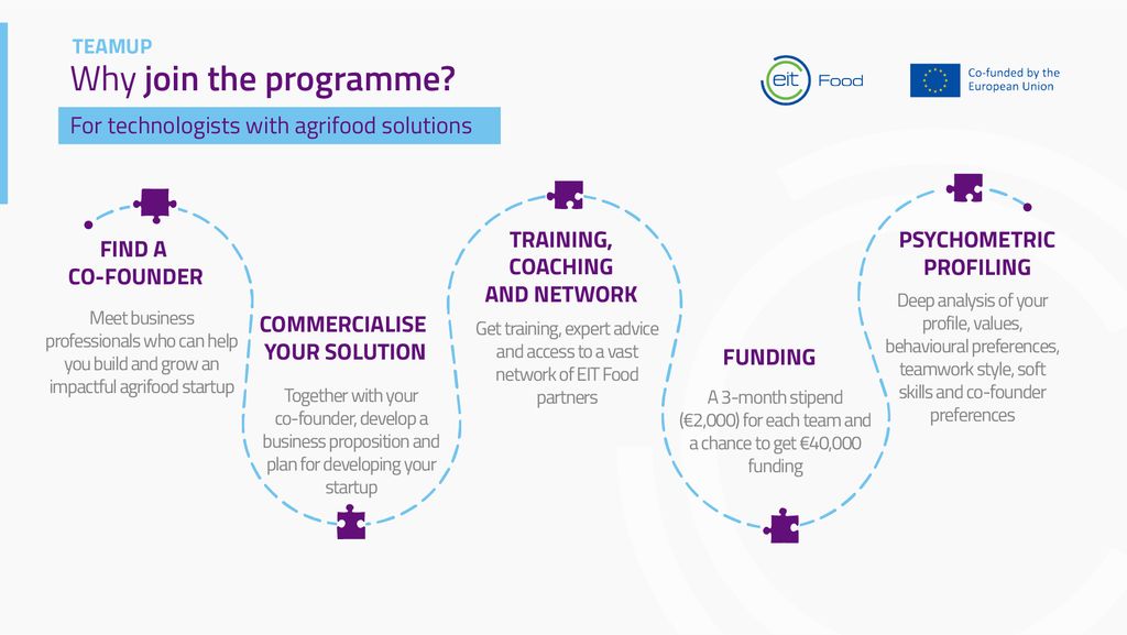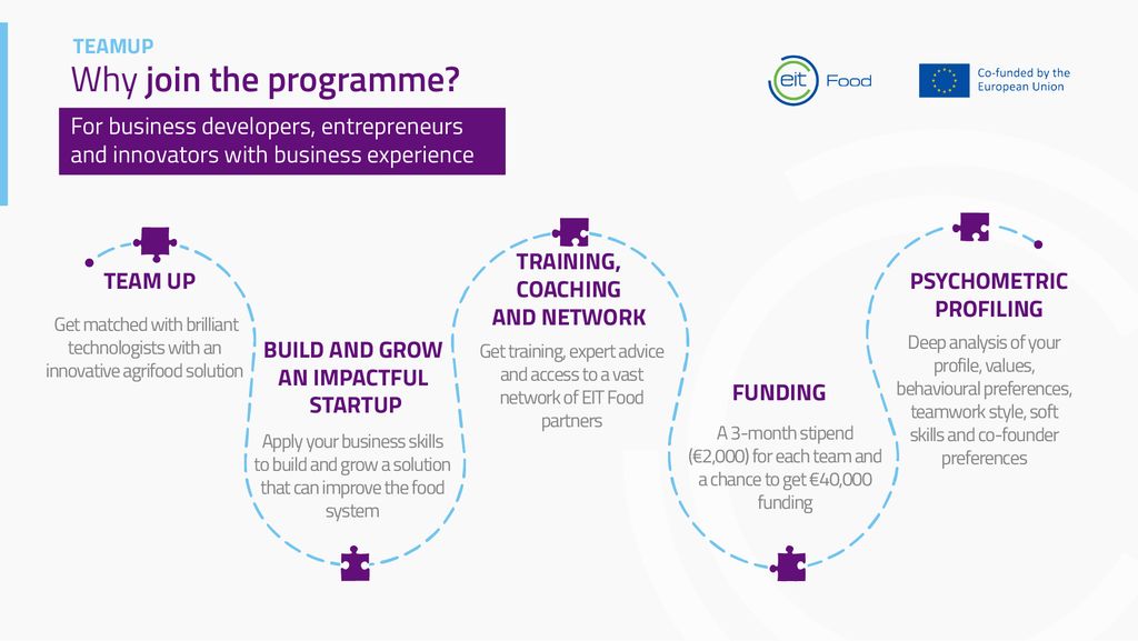 EIT food je oblikoval poseben program TeamUp, ki povezuje inovativne posameznike s podjetniki in jih podpira pri razvoju učinkovitih agroživilskih rešitev.