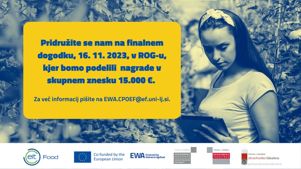 Pridružite se nam na finalnem dogodku, 16. novembra 2023, v centru ROG, na katerem bomo podelili nagrade v skupni vrednosti 15.000 €. Za več informacij pišite na: EWA.CPOEF@ef.uni-lj.si