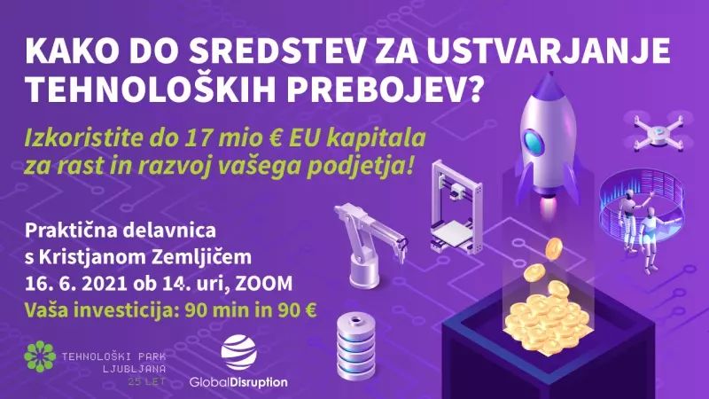 Tehnološki park Ljubljana in Global Disruption v sredo, 16. junija 2021, pripravljata delavnico za inovativna podjetja, ki za razvoj prebojnih tehnologij in vizionarskih idej o prihodnosti sveta potrebujete dodatna sredstva.