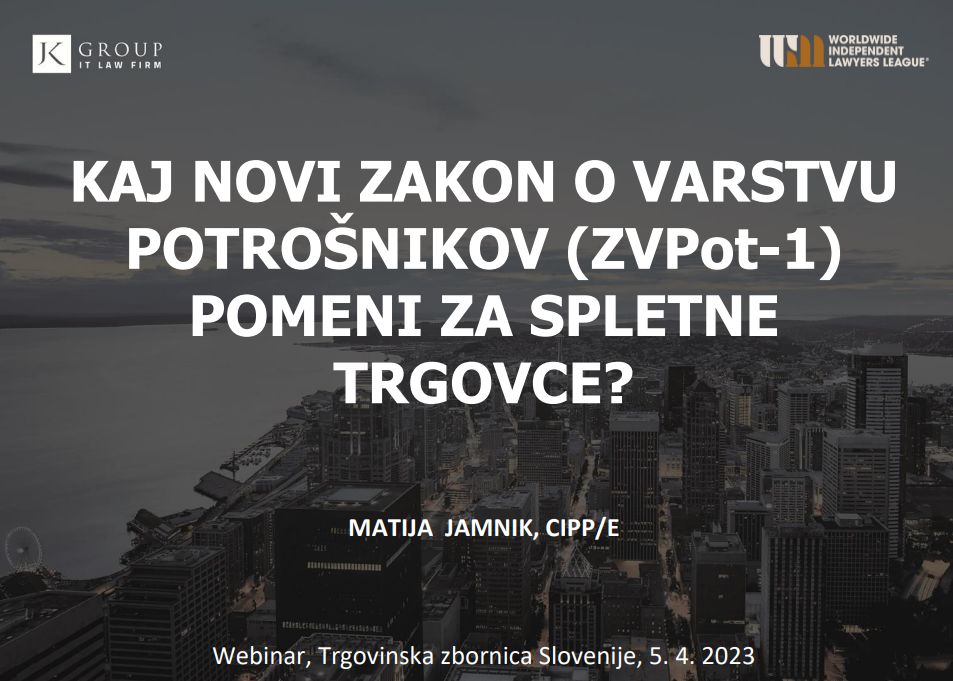 Eden izmed izjemno dobro obiskanih webinarjev na Trgovinski zbornici Slovenije je bil gotovo včerajšnji na temo novosti, ki jih novi ZVPot-1 prinaša za spletne trgovce. Matija Jamnik iz pravne in davčne pisarne JK group je udeležencem na podlagi številnih izkušenj predstavil praktične vidike vpliva nove zakonodaje na poslovanje spletnih prodajalcev na področjih dobave blaga, oglaševanja in označevanja znižanja cen, postopka v primeru, da potrošnik zahteva odpravo napake na blagu in s tem povezane regresne pravice.