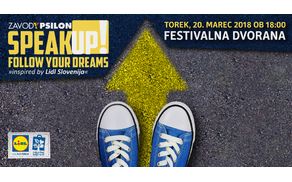 Peti dogodek Speak Up in drugi po vrsti, odkar je Zavod Ypsilon moči združil z Lidlom Slovenija, na oder že tradicionalno postavlja zgodbe navdiha. Tokrat bo Speak Up! Follow Your Dreams inspired by Lidl Slovenija potekal v torek, 20. marca 2018, ob 18.00 v Festivalni dvorani Ljubljana.