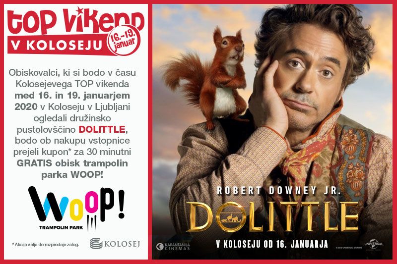 Obiskovalci, ki si bodo v času Kolosejevega TOP vikenda med 16. in 19. januarjem 2020 v Koloseju v Ljubljani ogledali družinsko pustolovščino DOLITTLE, bodo ob nakupu vstopnice prejeli kupon* za 30 minutni GRATIS obisk trampolin parka WOOP!