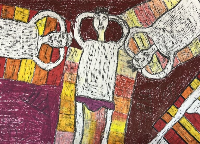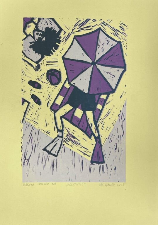 Nik je v tehniki barvnega linoreza izdelal grafiko, ki prikazuje dva prijatelja, ki uživata na plaži. Izbor kompozicije, barv odtisa in brezhibno izvedena tehnika nam ne pustijo drugega, kot vprašanje: kaj se dogaja na plaži, kaj se pogovarjata, se spoznavata?