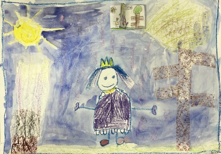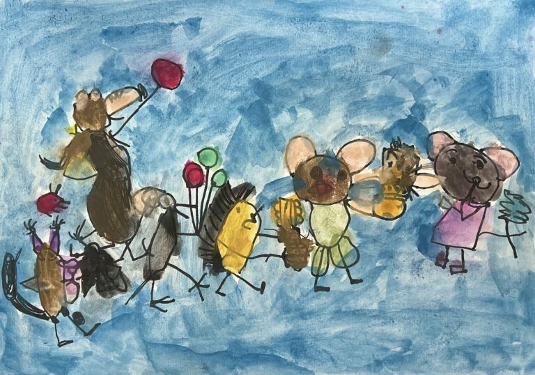 Mia je igrivo ilustrirala zgodbo o miški, ki je oklofutala medveda. Upodobila je živali, ki so med seboj v interakciji. Izgledajo kot vesela druščina, ki se nekam odpravlja. Risba s flomastrom in spontana kompozicija dajeta na sliki vtis veselja in optimizma. Bi se ji kar pridružili.