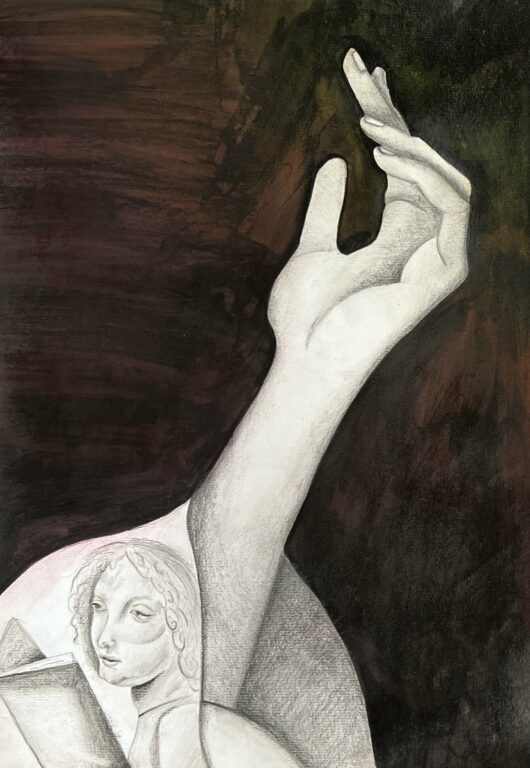 Sara je simbolno uprizorila vzvišenost branja. Uporabila je risarsko tehniko in motiv poudarila s temnim ozadjem. Pomen je poudarjen z diagonalno kompozicijo in močnim svetlo temnim kontrastom.