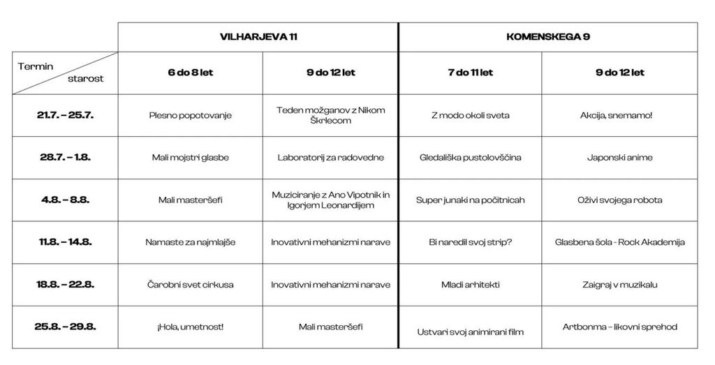 Bi radi raziskovali naravo, ustvarili svoj strip, eksperimentirali v laboratoriju, posneli čisto pravi film, se naučili žonglirati ali poglobili glasbeno znanje ob boku priznanih glasbenikov? Vas morda zanimajo oblačila in kultura Japonske, rubikova kocka ali palača spomina z Nikom Škrlecom? Ali pa raje izberete jogo, gledališče, ples, slikarstvo, grafiko, arhitekturo in še kaj povsem novega?