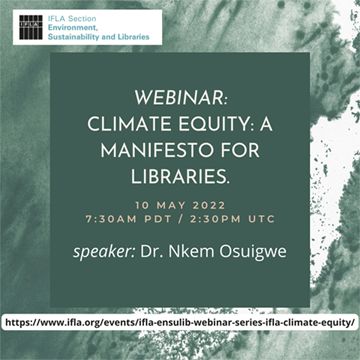 IFLA ENSULIB vabi na naslednjega v seriji spletnih seminarjev, tokrat na temo podnebne pravičnosti. Podnebne spremembe ne grozijo samo s povečanjem ekoloških katastrof, temveč tudi z zaostrovanjem družbenih neenakosti. V tej situaciji lahko knjižnice z informiranjem deležnikov in vodenjem družbenega dialoga pomembno prispevajo k podnebni pravičnosti. Predavala bo dr. Nkem Osuigwe, direktorica Afriške zveze knjižnic in informacijskih ustanov (AfLIA).