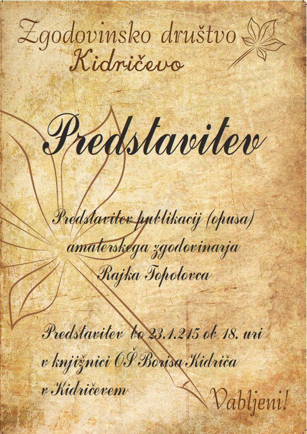 Zgodovinsko društvo Kidričevo vabi na predstavitev publikacij ljubiteljskega zgodovinarja Rajka Topolovca, ki bo v knjižnici Osnovne šole Borisa Kidriča Kidričevo, 23. 1. 2015.