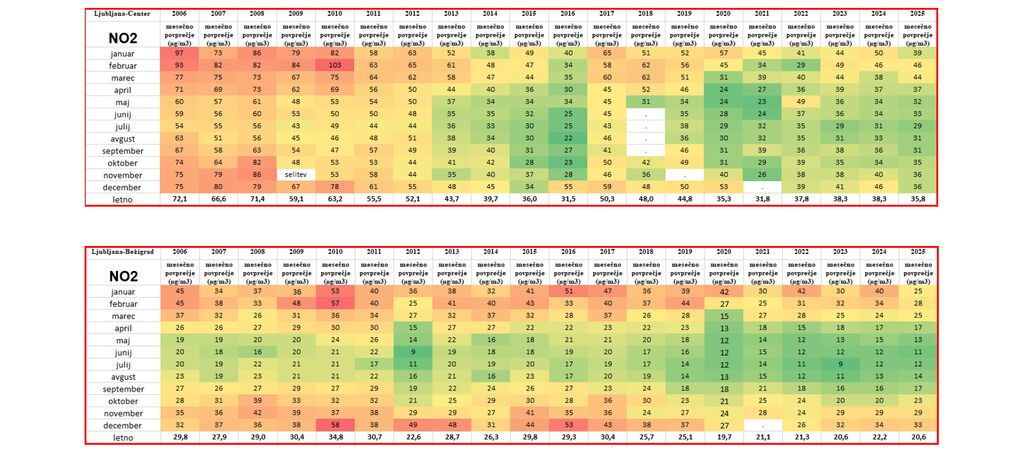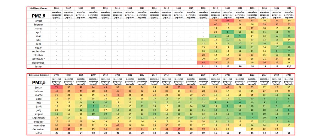 Podatki v tabelah prikazujejo, kako se v Ljubljani izboljšuje kakovost zraka