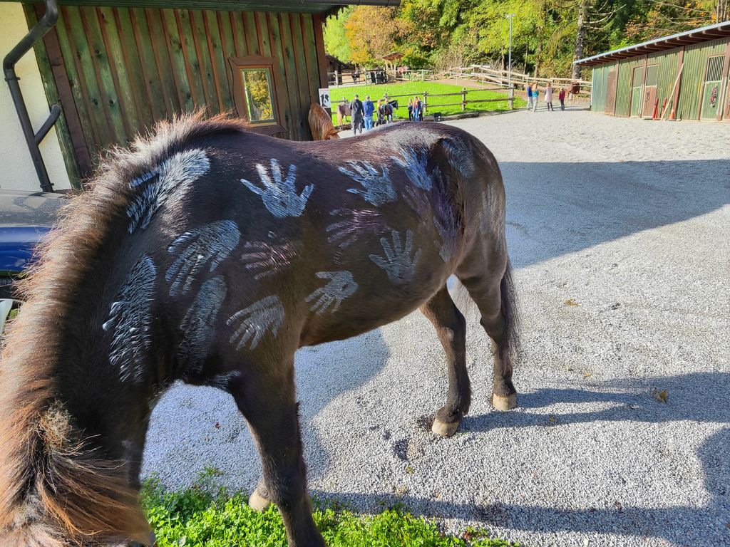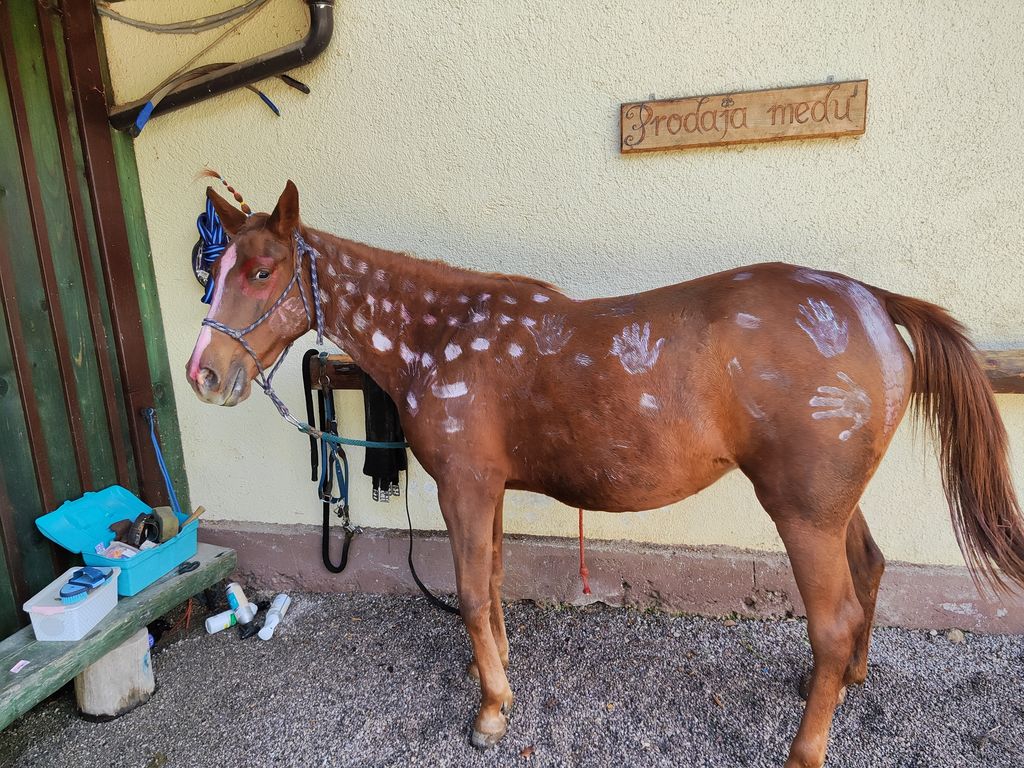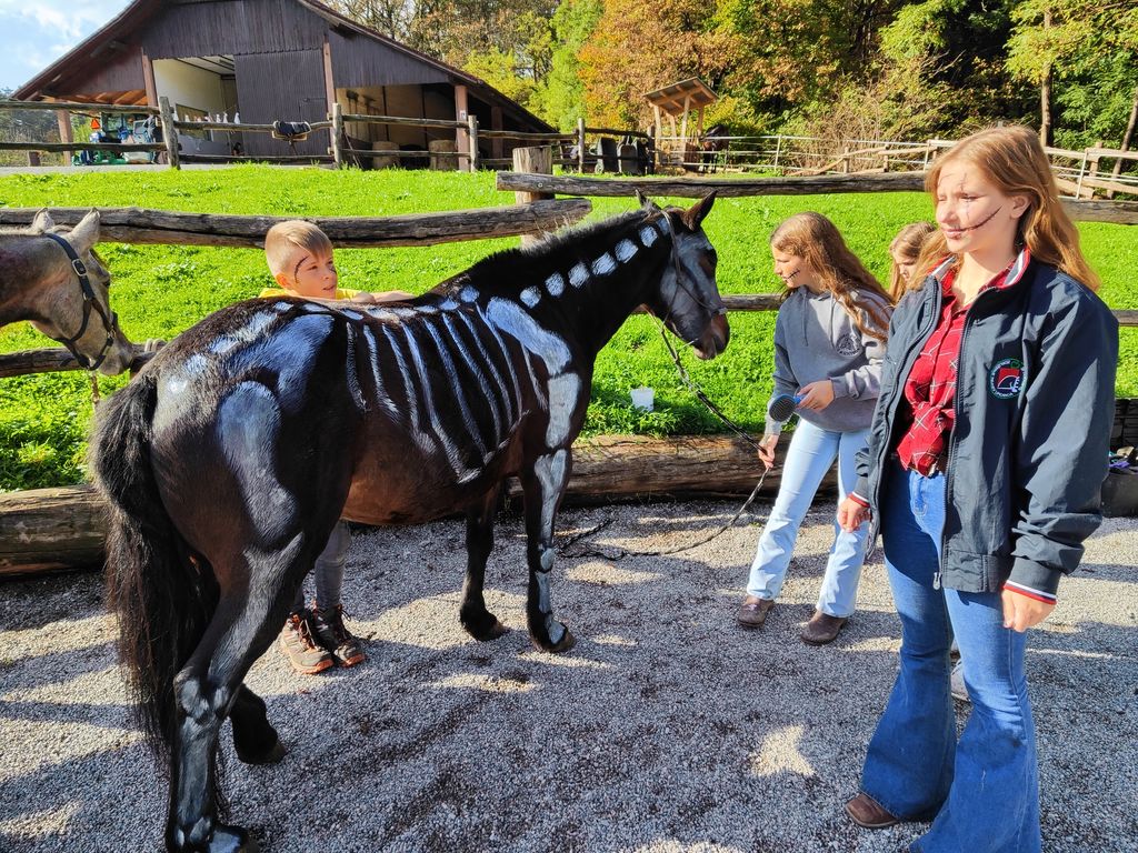 Po kratkem kostanjevem odmoru je sledila zabavna poslikava konj, eden se je spremenil v pravega kostkota. Konje so otroci lahko tudi zajahali v maneži in tako aktivno uživali prelep topel sončni jesenski dan. Pravo veselje po dolgotrajnem močnem deževju.