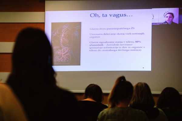 Doc. dr. Tjaša Stepišnik Perdih, predavateljica na FUDŠ in predstojnica oddelka za psihosocialno pomoč in svetovanje, nam je preko polivagalne teorije približala koncept odzivanja mladostnikov na zunanje (stresne) dejavnike, na starše in druge odrasle, vlogo simpatičnega in parasimpatičnega (ventralni in dorzalni del) živčnega sistema pri tem ter nas s slikovitim prikazom in praktičnimi primeri popeljala čez hierarhijo telesnih odzivov, od evolucijsko najnovejše “socialne angažiranosti”, kjer se še počutimo varni, preko stanja “beg” in “boj” do končne, zadnje in evolucijsko najstarejše obrambne linije “zamrznitve” oziroma kolapsa. Predstavila nam je tudi vagus – glavni živec parasimpatičnega živčnega sistema, ki uravnava delovanje skoraj vseh notranjih organov in je glavni signalizator stanja v telesu ter povedala, da je skoraj 90% informacij, ki jih prevaja iz črevesja v možgane, senzorično, iz česar sledi, da je veliko bolj učinkovito, če umirjamo telesno kot kognitivno.