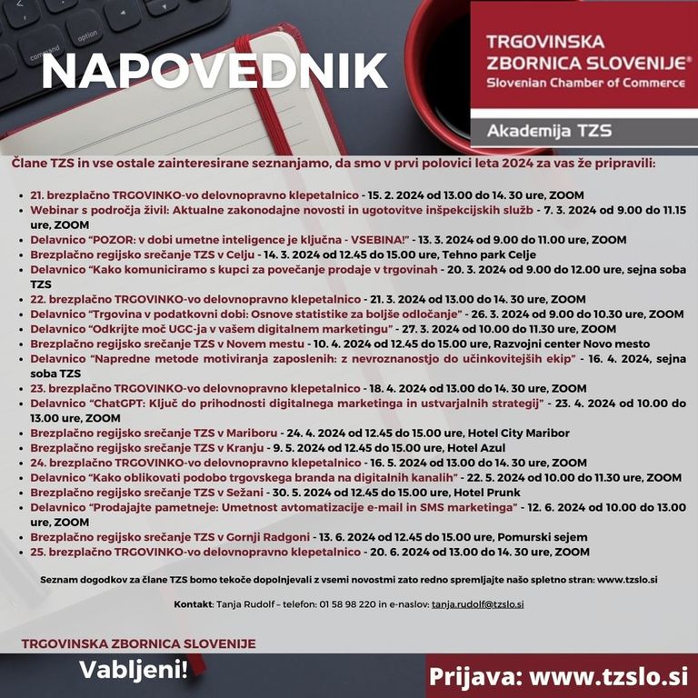 Vljudno vabljeni, da se nam pridružite na seminarjih in delavnicah, ki jih Trgovinska zbornica Slovenije organizira v prvi polovici leta 2024 za člane TZS in vse ostale zainteresirane!