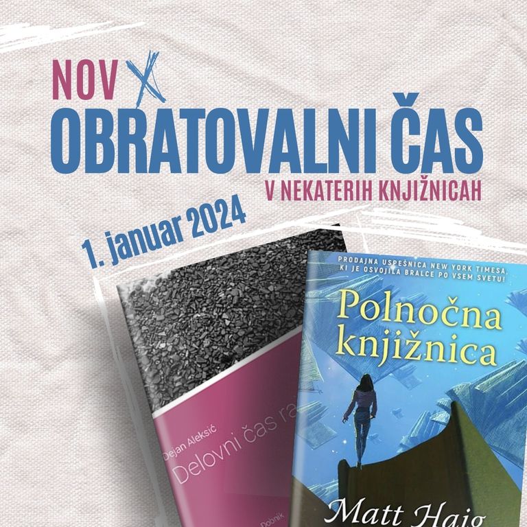Seznanjamo vas, da s 1.1.2024 stopa v veljavo nov obratovalni čas nekaterih enot v naši knjižnični mreži. Slediti moramo namreč zakonodajnim spremembam (Zakon o evidencah na področju dela in socialne varnosti – zagotavljanje pravice do odmora tistim knjižničnim delavcem, ki delajo v enoti sami, sprememba Uredbe o osnovnih storitvah knjižnic – zagotavljanje minimalne odprtosti enot v manjših krajih). Obenem smo s spremembami sledili statističnim podatkom o obiskanosti vsake posamezne enote preko dneva in spremembe izvedli tako, da še naprej ohranjamo skupno letno odprtost naših enot na enaki ravni kakor prejšnja leta ter poskrbeli za usklajenost delovanja knjižnic v celotni mreži glede na njihovo velikost (manjše krajevne knjižnice, večje krajevne knjižnice, knjižnice mestnih območij).