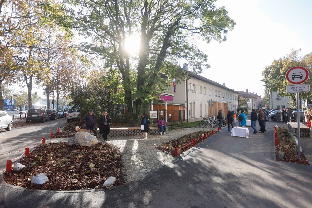Površino smo preuredili z zelenjem in prepustnimi površinami, kar omogoča, da voda ob močnem deževju ponikne, namesto da bi odtekla v kanalizacijo. 115 m² prometnih površin smo preuredili v zelene površine, namestili smo klopi, nova stojala za kolesa in zasadili kar 475 rastlin.