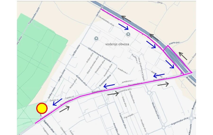 Obvoz bo potekal po Šmartinski cesti, Clevelandski ulici, cesti LZ 212393 in Kopni poti.