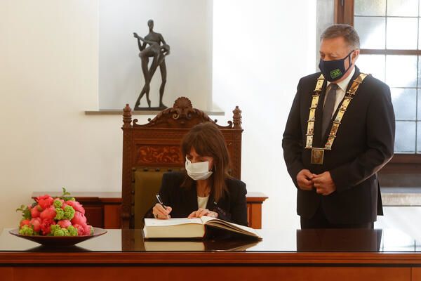 Katerina Sakellaropoulou je prva ženska predsednica Helenske republike. Svoj mandat je prevzela marca lani. Ob obisku je izpostavila, da ji je v veliko veselje obiskati Mestno hišo v Ljubljani, mestu z dolgo in bogato zgodovino, ki je povezana tudi z grško mitologijo in zgodbo o Argonavtih, saj naj bi tu Jazon ubil zmaja, ki je opustošil območje in s tem ljudi razbremenil te bojazni. Dodala je, da Ljubljana leži sredi Evrope in da Slovenija pripada isti evropski družini kot Grčija.