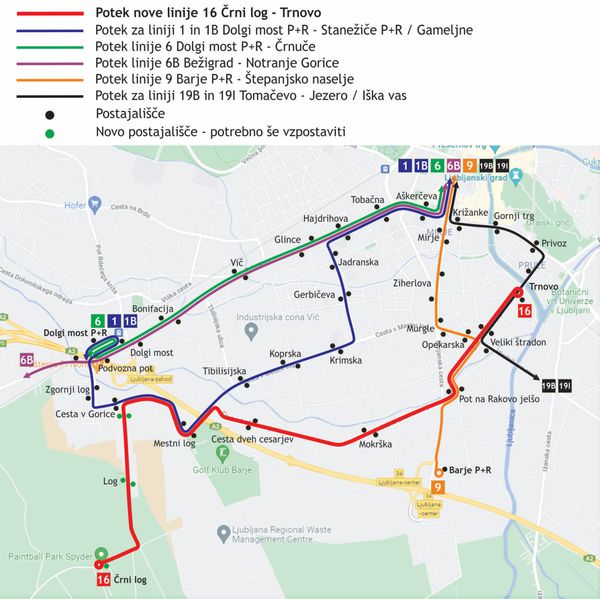 S postajališča Črni log bo linija potekala po obstoječi trasi po Cesti dveh cesarjev do postajališča Mokrška, nato pa bo nadaljevala pot v smeri Opekarske ceste mimo postajališč Pot na Rakovo jelšo in Veliki Štradon, do končne postaje Trnovo. Na linijo 16 bodo potniki lahko prestopali z linij 1, 9, 19B in 19I.