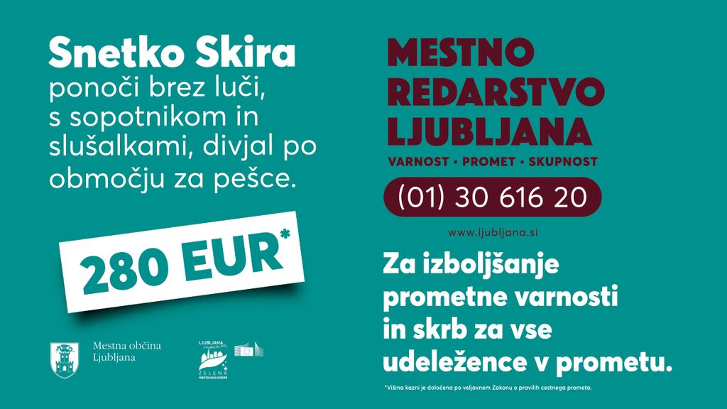 Zato smo pripravili novo preventivno kampanjo "Snetko Skira", s katero opozarjamo na nevarna ravnanja v prometu, ki jih pogosto opažamo v mestu. Med njimi so vožnja e-skiroja ponoči brez luči, vožnja s slušalkami ali s sopotnikom, vožnja po površinah, namenjenih pešcem, neupoštevanje pešcev pri vožnji s kolesom ter vožnja motornega kolesa brez zaščitne čelade.