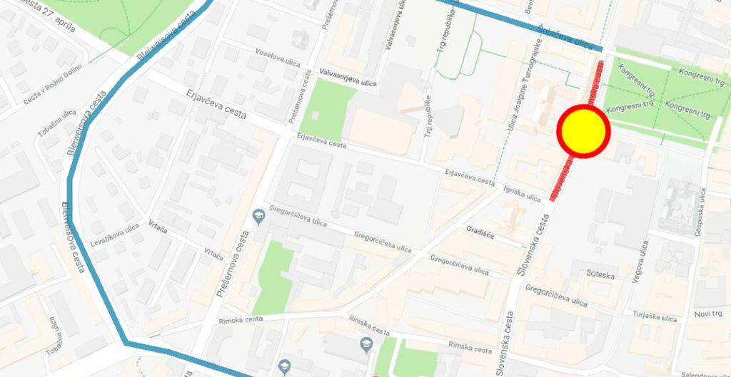 Zaradi državne proslave ob dnevu državnosti bo v sredo, 24. junija 2020, od 20. do 23. ure za ves promet zaprta Slovenska cesta na odseku med Šubičevo ulico in Erjavčevo cesto.