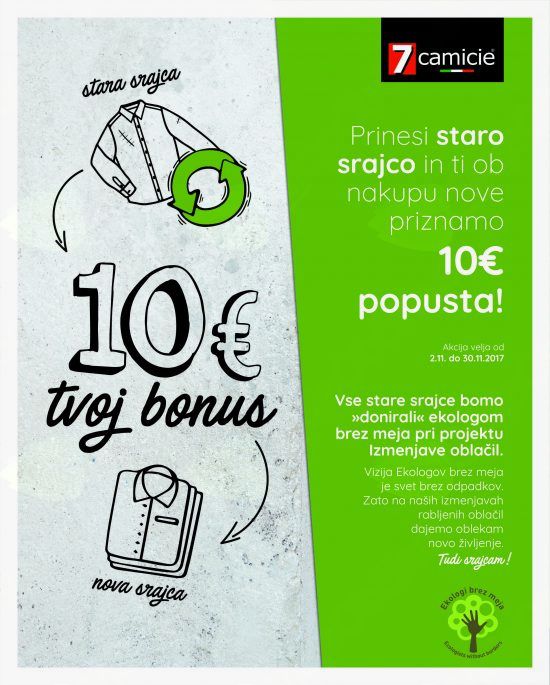 Zato smo bili prijetno presenečeni, ko nas je k sodelovanju povabilo podjetje Ambient, ki v Sloveniji upravlja trgovine 7camice. Na dan so prišli z idejo, da lahko kupci prinesejo rabljene moške srajce in ob nakupu nove dobijo popust. Nič tako zelo novega, bi kdo rekel! Res, a nadaljevanje je bistveno drugačno. Stara srajca namreč ne bo zginila v črno brezno skrivnostnih zabojnikov, ampak jo bodo nemudoma dostavili nam, da jih obiskovalcem ponudimo na izmenjavah oblačil.
