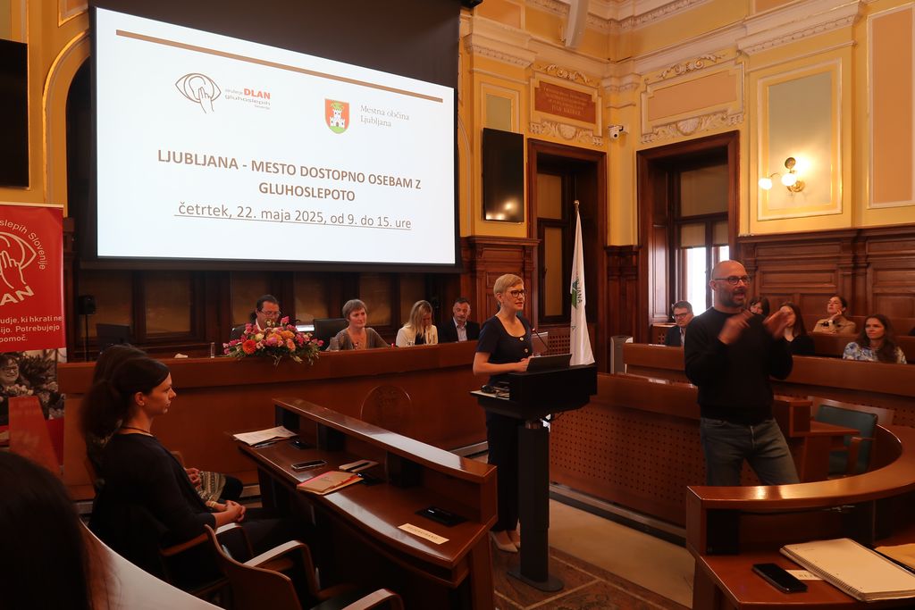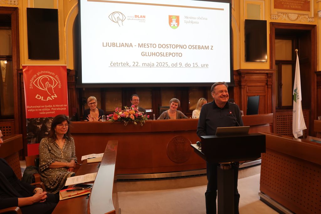 V veliki sejni dvorani Mestne občine Ljubljana je potekal strokovni posvet z naslovom Ljubljana – mesto dostopno osebam z gluhoslepoto, ki ga je 22. maja 2025, organiziralo Združenje gluhoslepih Slovenije DLAN v sodelovanju z Mestno občino Ljubljana.