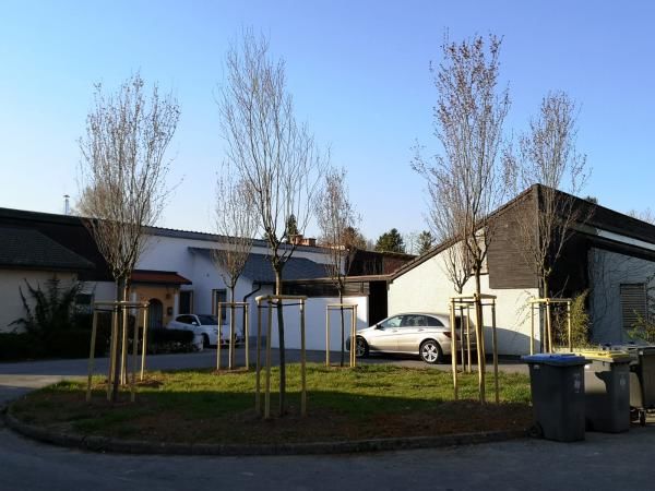Drevesa so v zadnjih letih izkazovala slabo vitalnost in višinsko prirast, eno izmed njih se je lani posušilo, dve pa sta bili zelo prizadeti in tik pred odmrtjem. Ta tri drevesa smo odstranili in jih nadomestili z novimi, nadstandardnimi sadikami.