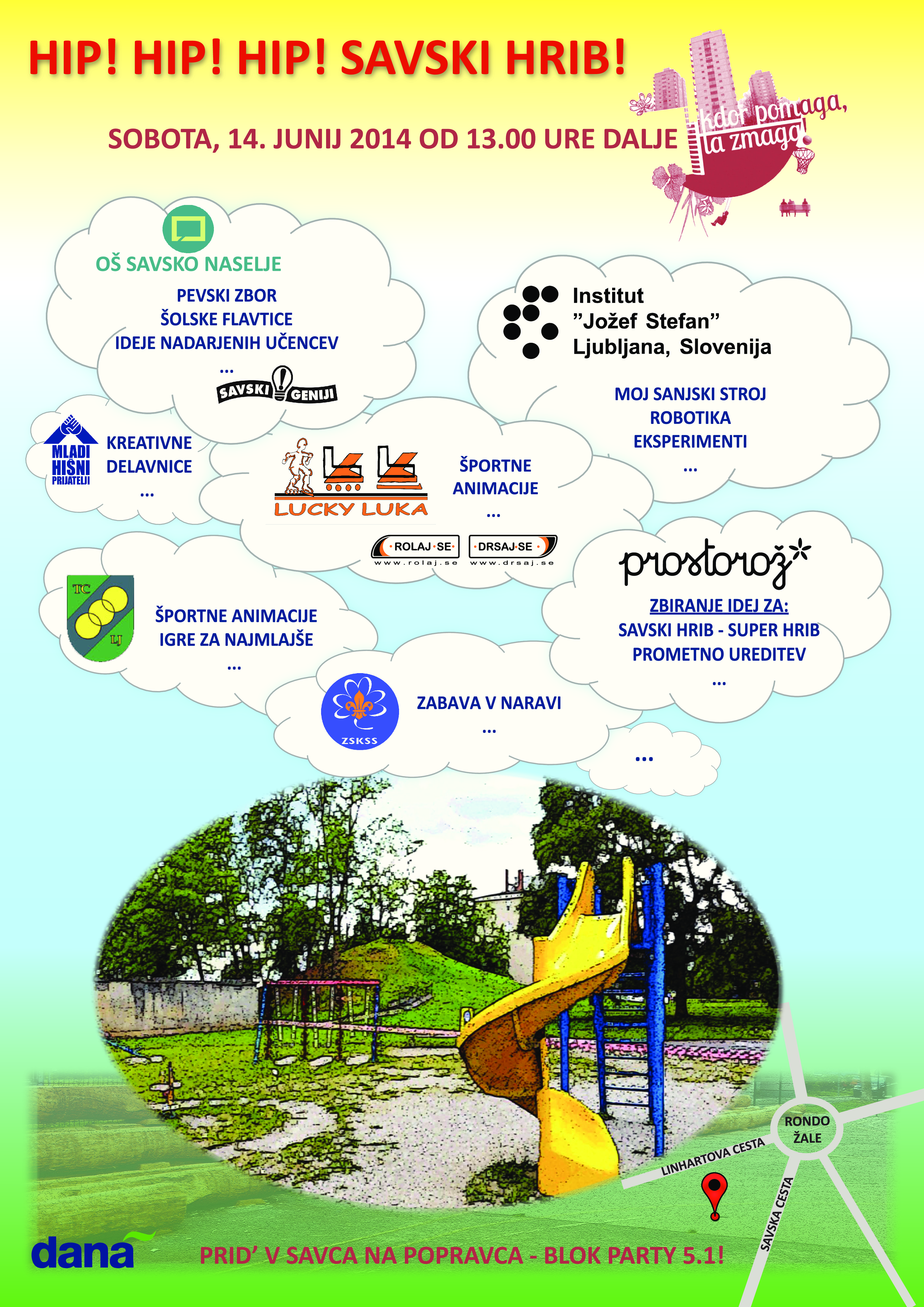 Tokratna rdeča nit festivala je predstavitev letošnjega projekta pod okriljem Osnovne šole Savsko naselje - Hip Hip Hip - Superhrib. Učenci iz šole so v začetku šolskega leta skupaj z mentorstvom Alenke Korenjak iz društva Prostorož razvili sanjsko idejo o svojem igrišču in hribu. Ideja bo predstavljena na Blok Party-u 5.1, ki bo 14.6.2014 na lokaciji Mislejeva 3. Poleg družabnih dejavnosti bodo na voljo tudi športne igre, delavnice in veliko dobrot za naše najmlajše. Poleg tega se bo v sosednjem Gas stationu tudi odvijal tradicionalni Beerfest za malce starejše, tako da ste vabljeni vsi predstavniki vseh generacij. Se vidimo:)