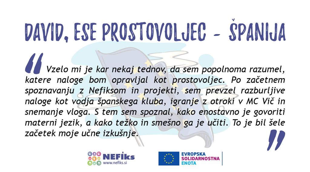 Mladi lahko številne kompetence pridobijo tudi z udejstvovanjem v programih Evropske solidarnostne enote. Ena od možnosti znotraj programa ESE je mednarodno prostovoljstvo, katero omogoča posamezniku, da opravlja mednarodno prostovoljstvo do 12. mesecev v drugi državi. David, ESE prostovoljec, ki smo ga na Zavodu Nefiks gostili do konca februarja je na sredini svoje prostovoljske izkušnje povedal, da je to obdobje zanj ne le priložnost za učenje, pridobivanje novega znanja in odkrivanje Slovenije, ter kako zelo ga ta izkušnja izpopolnjuje.