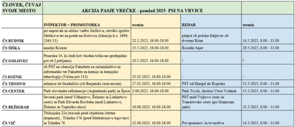Spomladanski del akcije začenjamo v torek, 13. maja 2025, v Četrtni skupnosti Rožnik in zaključujemo v četrtek, 12. junija 2025, v Četrtni skupnosti Vič. Tokratna akcija bo sicer potekala v četrtnih skupnostih Rudnik, Šiška, Golovec, Trnovo, Center in Bežigrad.