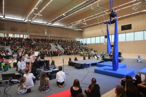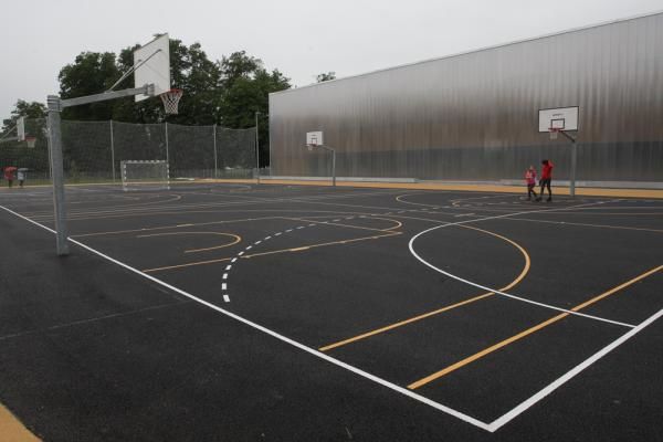 Poleg telovadnice smo uredili še športno igrišče, parkirišče in ploščad. Glavna dvorana s spremljajočimi prostori je umeščena v kletno etažo, v pritličju so tribune in kabineti, v medetaži pa dve večnamenski dvorani s spremljajočimi prostori.