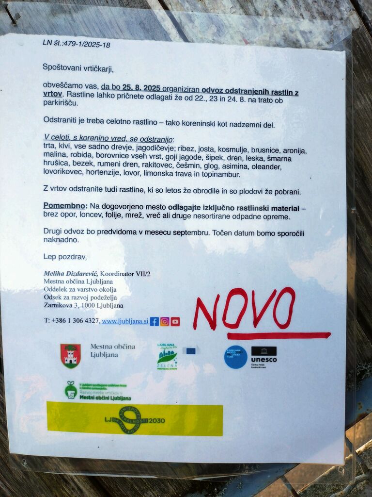 Na vrtičkarskem območju Ježica je Mestna občina Ljubljana (Oddelek za varstvo okolja, Odsek za razvoj podeželja) sprejela odločitev, ki je med vrtičkarji sprožila val ogorčenja. Upravljalec je namreč prepovedal gojenje številnih rastlin – od vinske trte, kivija in vsega sadnega drevja do jagodičevja, kot so ribez, josta, kosmulje, brusnice, aronija, šipek, dreni, rakitovec, šmarna hrušica, pa tudi hortenzije, lovor, limonska trava in topinambur. Vse te rastline bodo morali zakupniki odstraniti skupaj s koreninami, za njihov odvoz pa je občina organizirala termin 25. avgusta 2025.